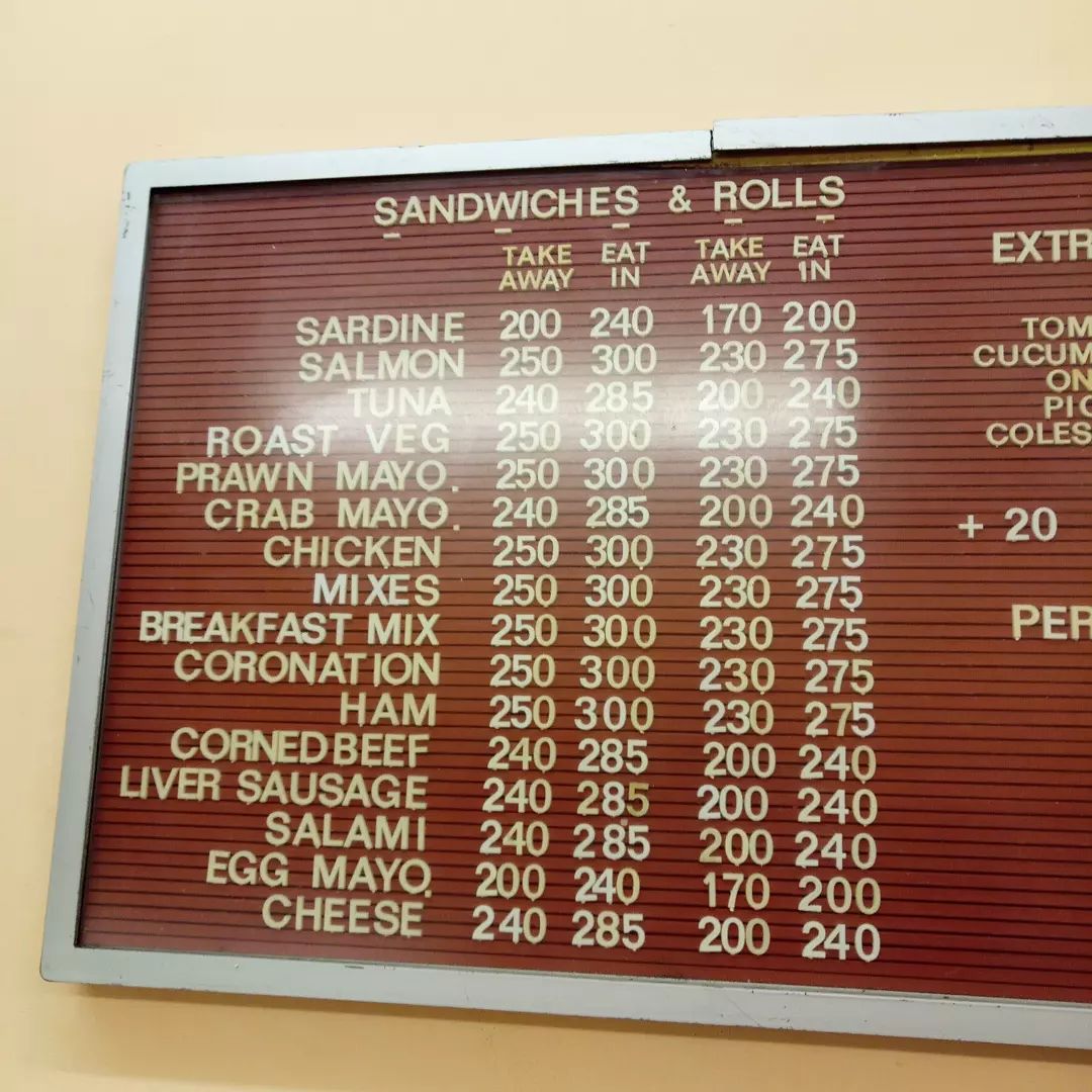 - Sandwiches & Rolls: A diverse range of sandwiches featuring fillings such as sardine, salmon, tuna, roast vegetables, crab mayo, chicken, mixed options, as well as breakfast mixes, coronation chicken, ham, corned beef, liver sausage, salami, egg mayo, and cheese. This category offers a broad selection for casual dining or takeout.